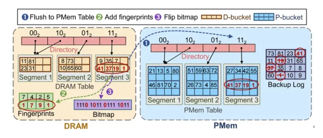 首先,DRAM 桶與 PMem 桶在邏輯佈局上嚴格對齊,使得 DRAM 桶滿時其內容能高效批量刷寫至 PMem 對應位置。當 PMem 中某個段需要分裂以擴容時,系統將舊段所有數據讀入 DRAM,在此過程中主動識別並消除同一鍵的多個版本的無效值,僅保留其最新的有效項,並將合併、去重後的結果寫入新分配的段。此過程自然跳過了已標記刪除的項,從而在完成容量擴展的同時,一舉實現了存儲空間的即時回收與整理,保持了 PMem 存儲的緊湊性與查詢效率。