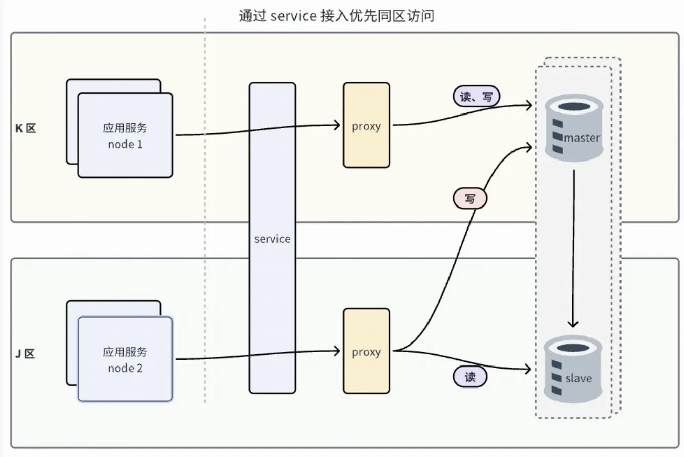 同城雙活就近讀場景下,業務訪問 Redis 時,需要 SDK 優先訪問同可用區proxy,proxy 優先訪問同可用區 server節點,其中proxy優先訪問同區 server 節點由 proxy 實現,但是在自研 DRedis SDK 之前,LB 無法自動識別應用所在同區的 proxy 並自動路由,因此需要藉助service 的同區就近路由能力,同城雙活就近讀需要通過容器 proxy+service 接入。
