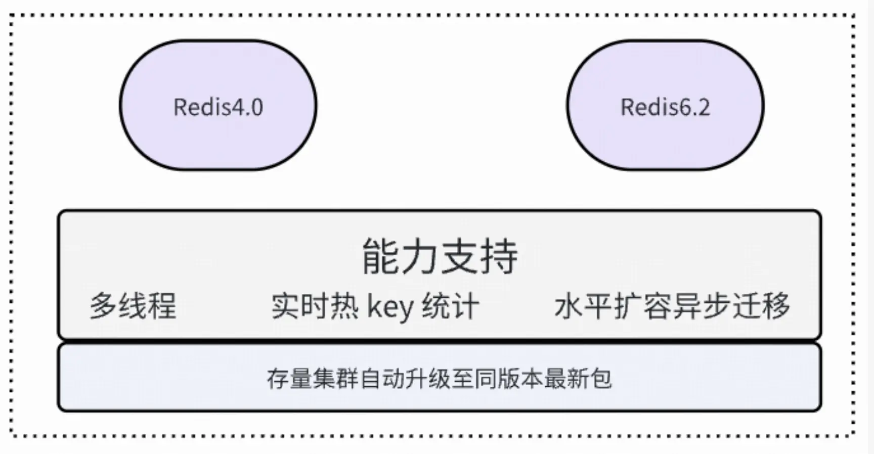 不管是 Redis4.0 還是 Redis6.2 版本,均支持了多線程特性、實時熱 key 統計能力、水平擴容異步遷移 slot 能力,存量集羣隨着日常資源均衡遷移調度,集羣節點版本會自動升級到同版本的最新安裝包。