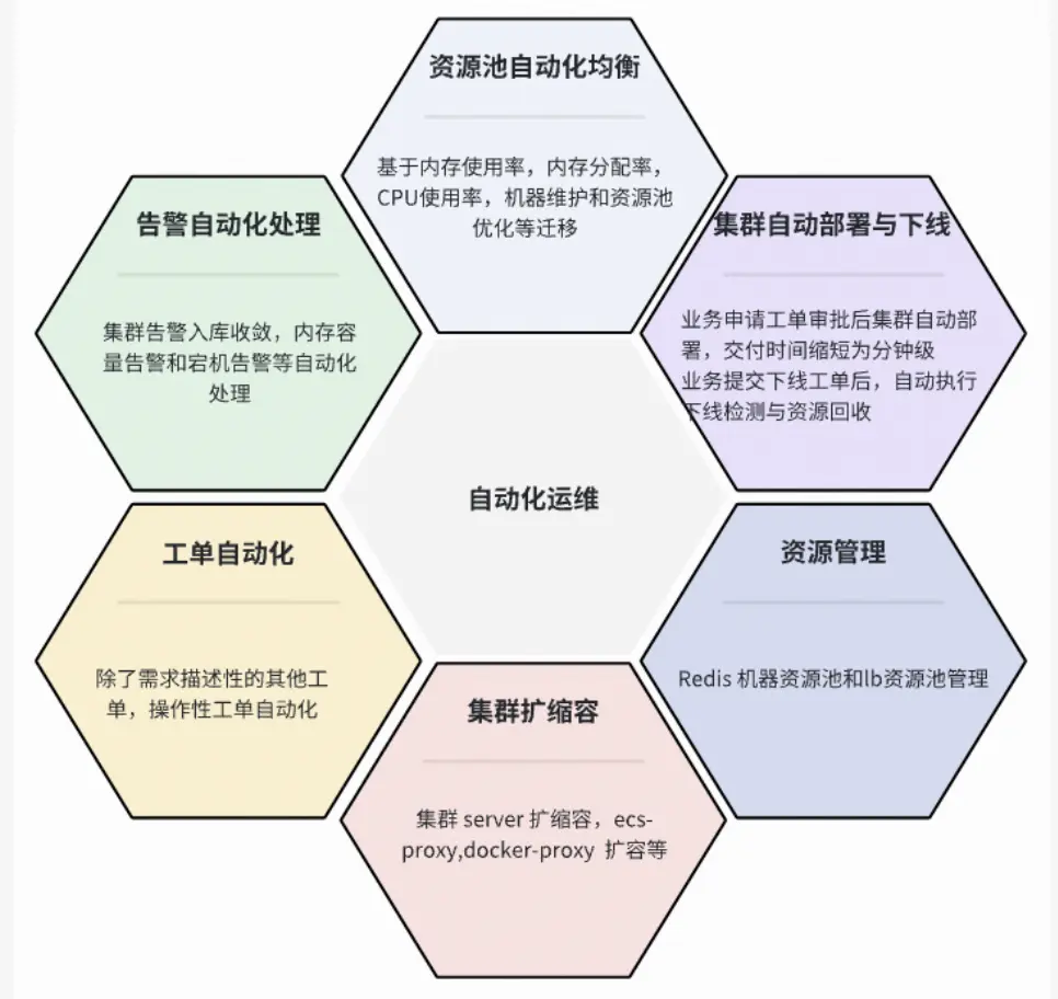 自建 Redis 系統還包含一個功能完善的自動化運維平台,一直以來,自建Redis一直在完善系統自動化運維能力,通過豐富的自動化運維能力,實現集羣全生命週期自動化管理,資源管理與智能調度,故障自動恢復等,提高資源利用率、降低成本,提高運維效率。