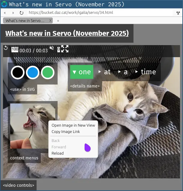隨着版本迭代,Servoshell 演示瀏覽器的功能正持續增強。更多改進詳情請參閲 Servo.org 博客文章:https://servo.org/blog/2025/12/15/november-in-servo/