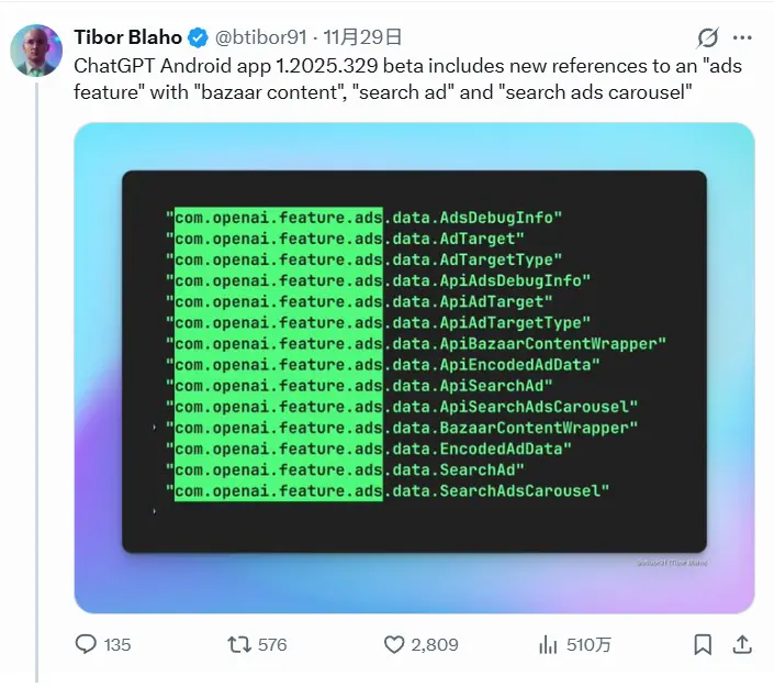 據X用户Tibor表示,在最新ChatGPT安卓1.2025.329測試版中,開發者發現新增“ads feature”“search ad”“bazaar content”等字符串,暗示廣告功能已進入開發階段。