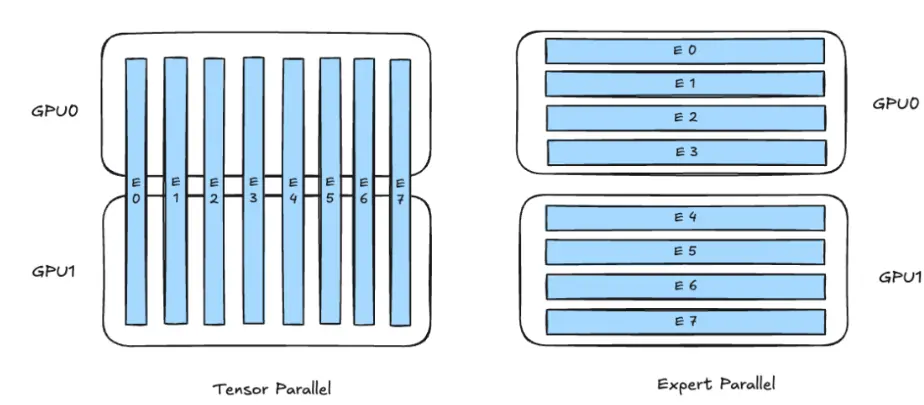 大模型中的MoE模塊推理時一般有兩種並行策略:TP並行(Tensor Parallel)和 EP並行(Expert Parallel),如下圖所示。 EP並行時,每個 GPU 負責一部分專家(Experts),不同 GPU 上的專家各不相同,而TP並行是將單個專家(例如 MLP 的權重矩陣)在多 GPU 之間做切分,共同計算。