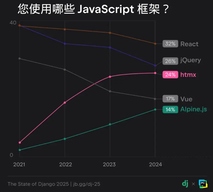 但自 2021 年 Django 調查啓動以來,技術趨勢已逐漸向服務器端模板迴歸。 HTMX 的使用率從 2021 年的 5% 增長至 24%,Alpine.js 則從 3% 增長至 14%。 與此同時,React 和 jQuery 的使用率持續下降:React 從 2021 年的 37% 降至 32%,jQuery 降至 26%。 值得注意的是,作為第三大熱門 JavaScript 框架的 Vue 的同期使用率也從 28% 降至 17%。