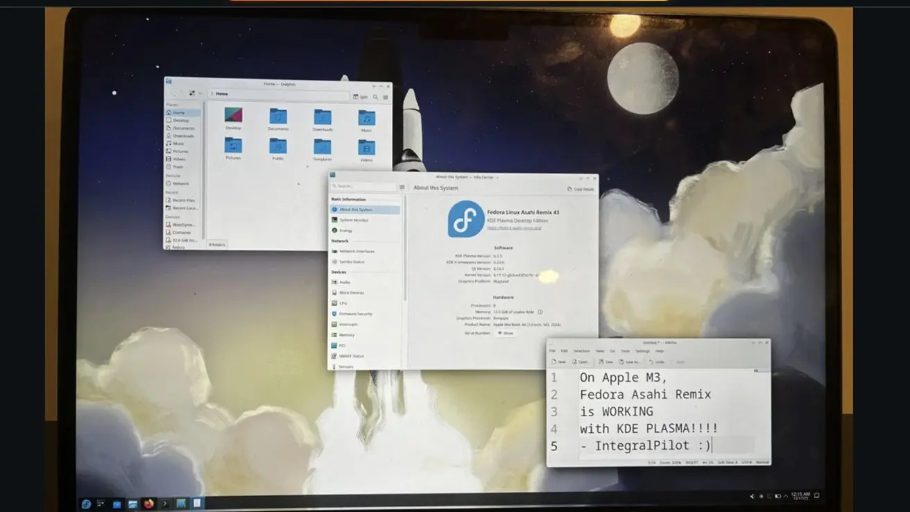 本週一,Asahi Linux 貢獻者 IntegralPilot 在 Reddit 上發佈了一張照片,顯示 Fedora 43 Asahi Remix 已能在搭載 M3 芯片的 Mac 上運行,桌面環境為 KDE Plasma。 他表示,其他用户也已在配備 M3 Pro 與 M3 Max 芯片的機型上成功啓動 Linux,不過這些安裝都存在重大限制。 目前系統“確實可以啓動”,但就終端用户體驗而言仍遠稱不上理想。