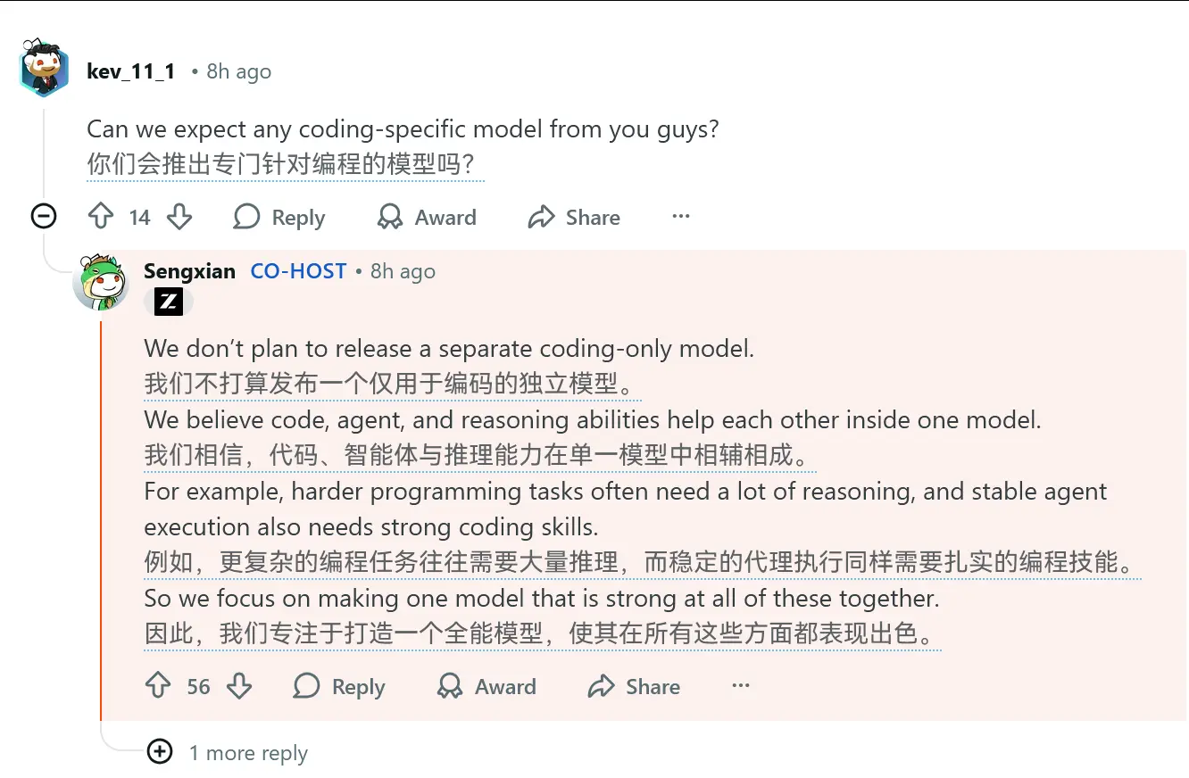 來源:https://www.reddit.com/r/LocalLLaMA/comments/1ptxm3x/ama_with_zai_the_lab_behind_glm47/