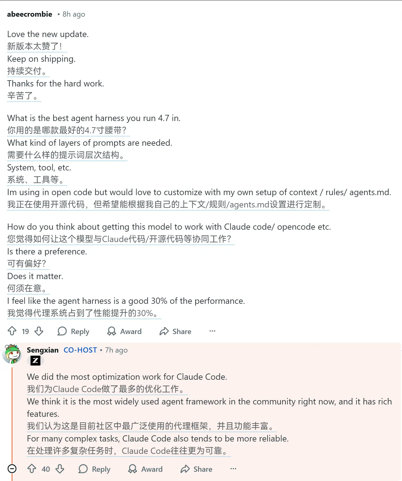 智譜團隊還在回答中指出,他們為 Claude Code 做了最多的優化工作。而 Claude Code 之外,Droid CLI 針對 GLM 模型進行了出色的提示詞調優,因此在現有生態中表現較好。
