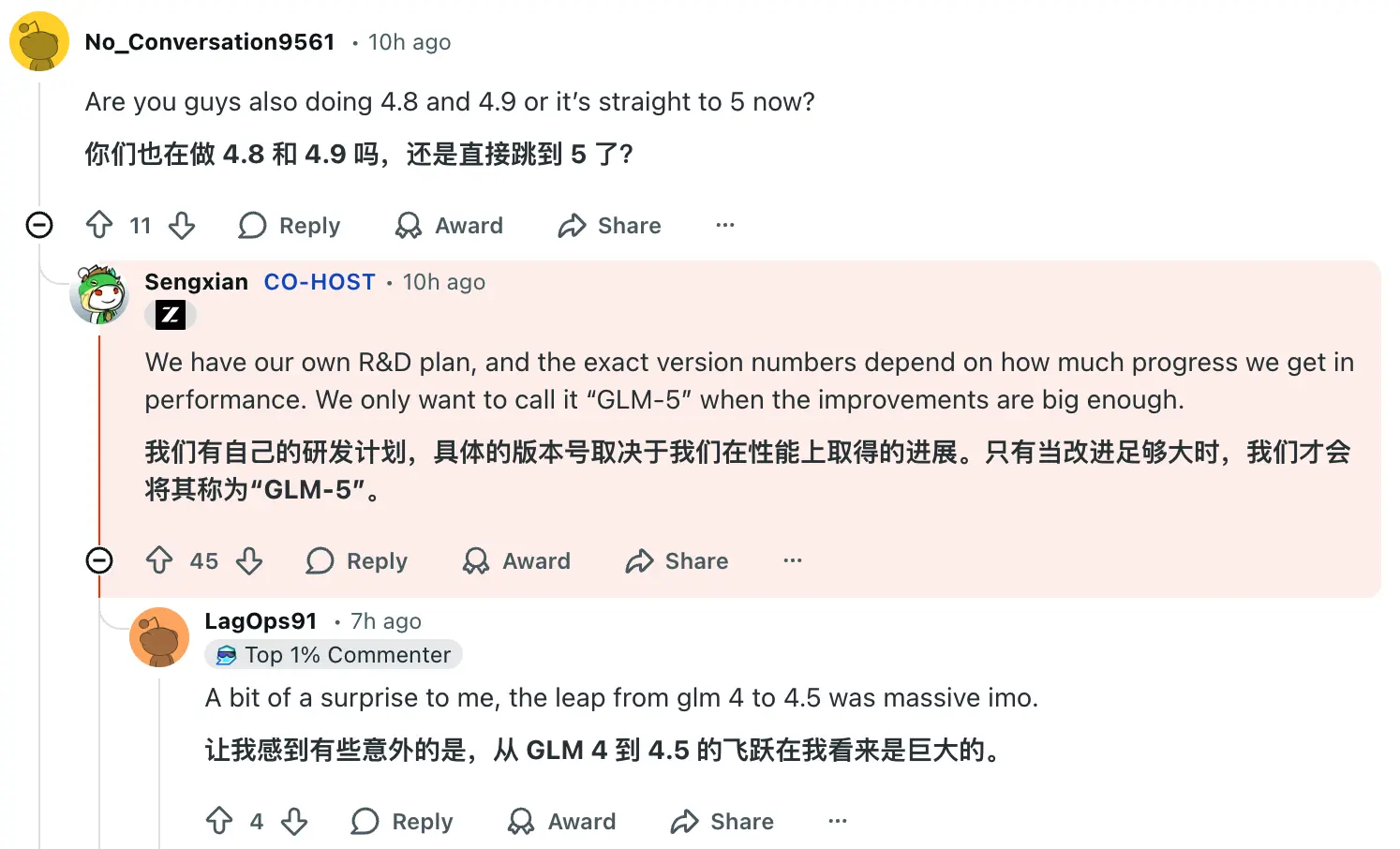 近日,智譜團隊在 r/LocalLLaMA 舉行了 AMA 問答,回答了關於模型迭代與開發生態等問題。在關於模型迭代的提問中,針對社區關於是否會有 GLM-4.8 或 GLM-4.9 版本的詢問,智譜團隊表示,版本號的命名取決於模型性能的進展。只有當模型性能有足夠顯著的改進時,才會將其命名為 GLM-5。