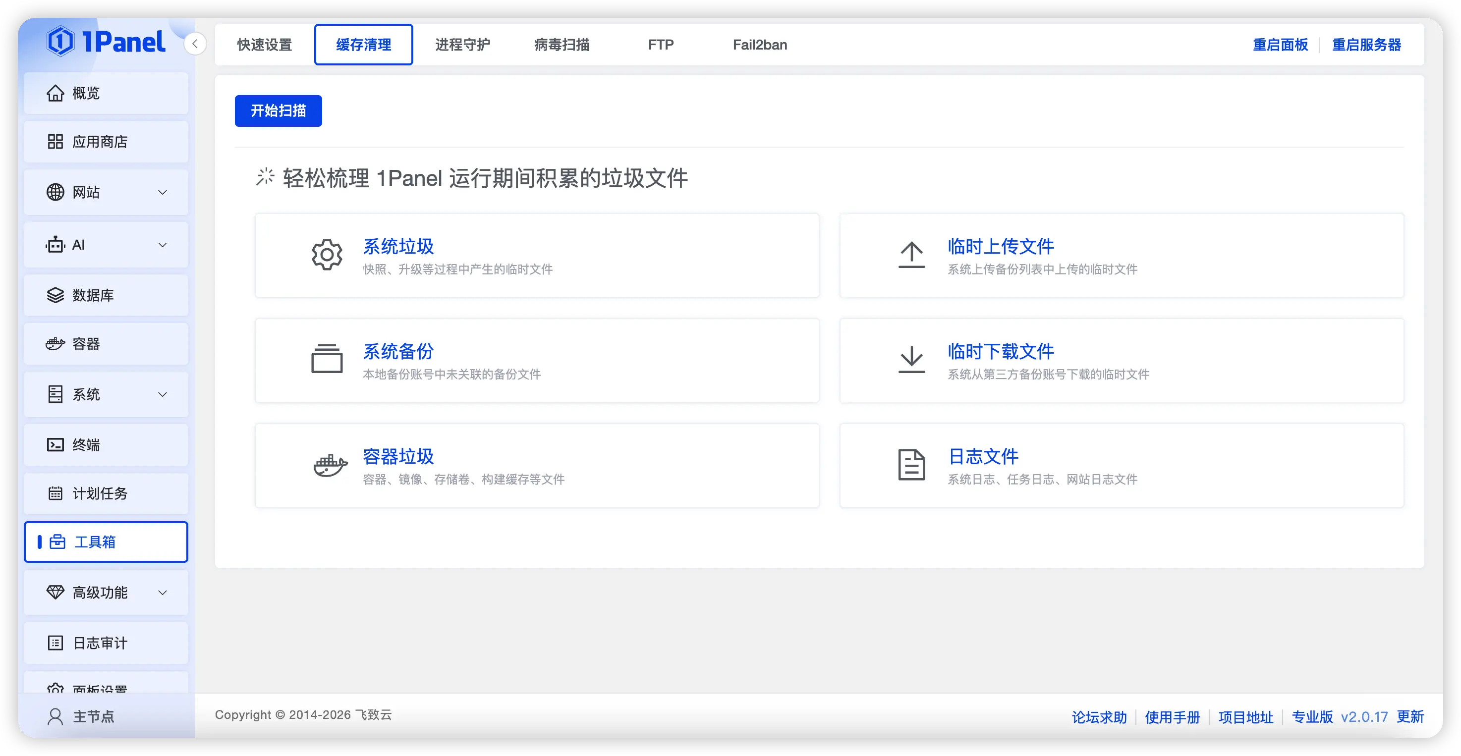 在 v2.0.17 版本中,1Panel 進一步增強了緩存與冗餘數據清理能力,新增支持清理未關聯的備份文件、網站日誌以及應用歷史版本安裝包等內容。通過集中清理長期累積的無效數據,幫助用户有效釋放磁盤空間,減輕磁盤佔用壓力。