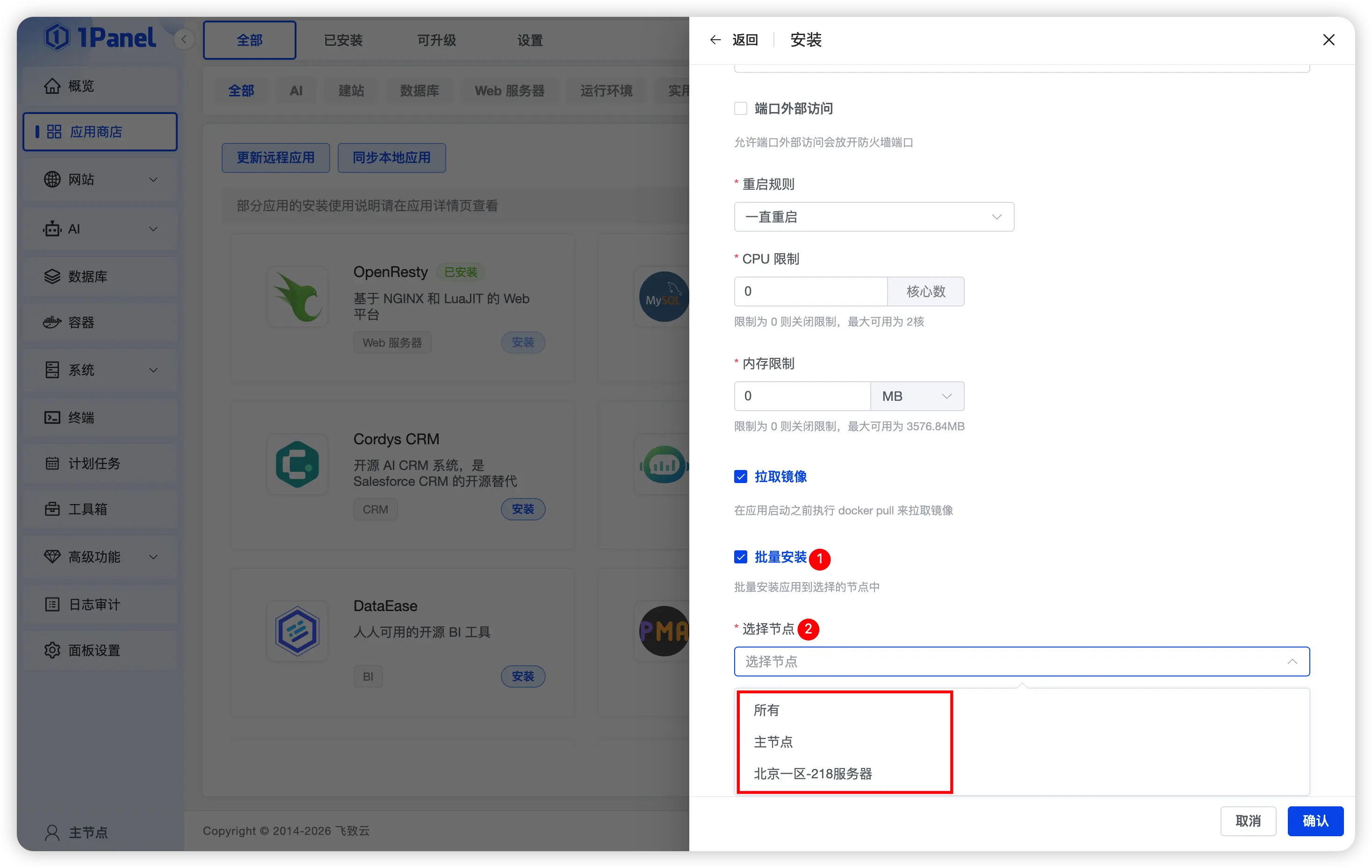 在 v2.0.17 版本中,1Panel 應用商店新增應用多主機部署功能。該功能支持在應用部署過程中一次性選擇多個目標主機,實現跨主機的應用安裝與集中管理。