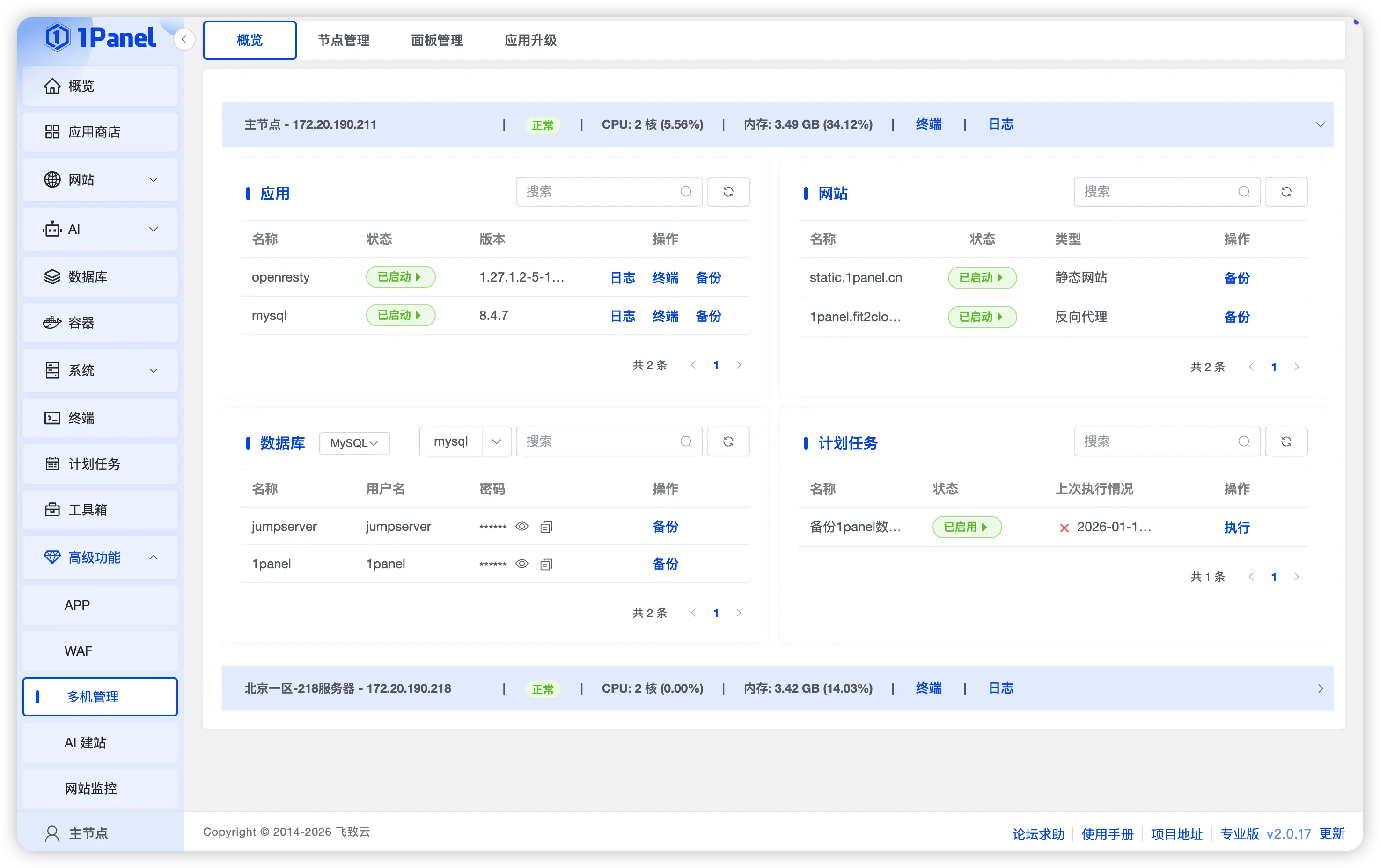 1Panel v2.0.17 版本新增多項功能。多機管理(X-Pack)方面,1Panel 新增多節點概覽功能,用户可以在主節點統一查看並管理各從節點的已安裝應用、網站、數據庫及計劃任務,顯著提升多節點環境下的可視性與集中管理效率;同時,在添加從節點時支持啓用代理模式,有效降低複雜網絡環境下的節點接入與部署門檻。