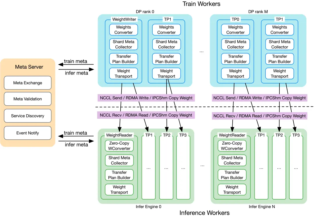 靈活可插拔架構:支持對不同模型定製化權重 Sharing 和 Layout 行為,同時支持新的訓練和推理引擎接入。