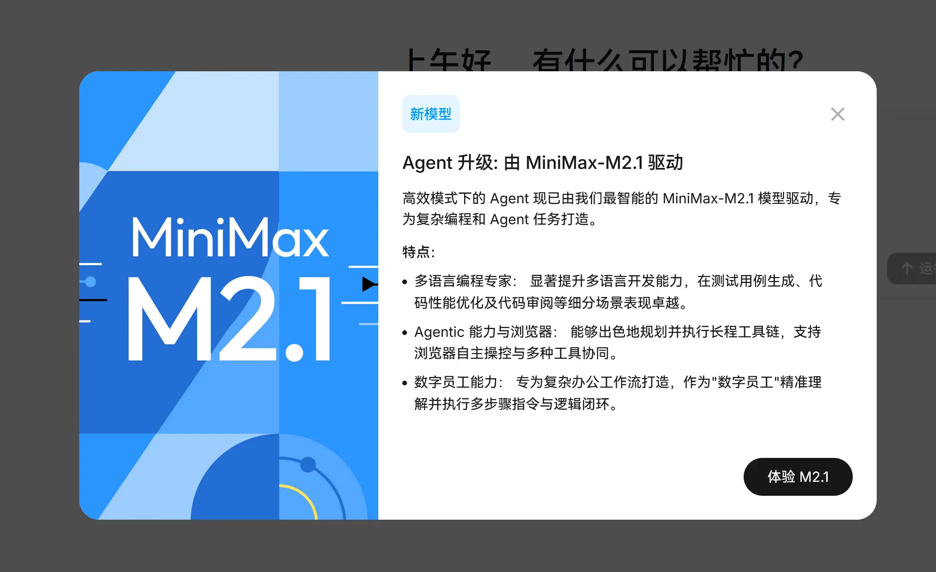 MiniMax 在 MiniMax Agent 平台中上線了其最新的 M2.1 模型。