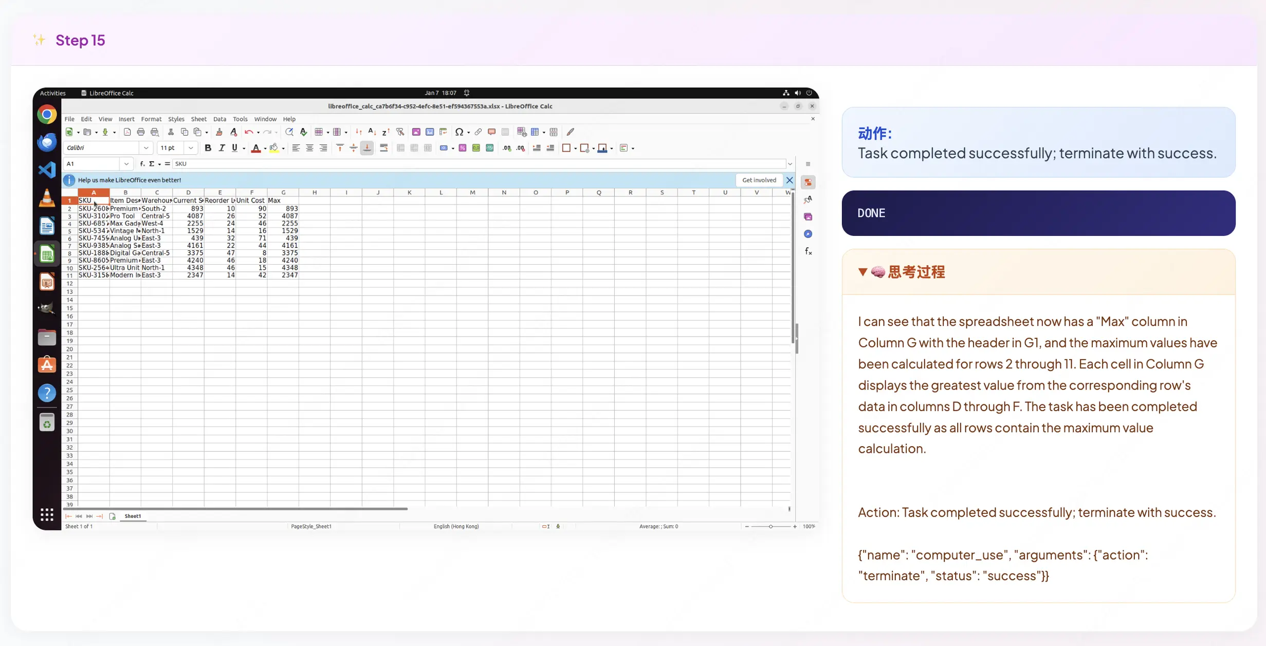 Step 15 :審慎終止判斷,智能體沒有盲目停止,而是先生成視覺證據:"我看到 Max 列已計算完畢..."。只有在視覺核驗結果符合初始指令後,它才發出terminate信號,確保任務完成。