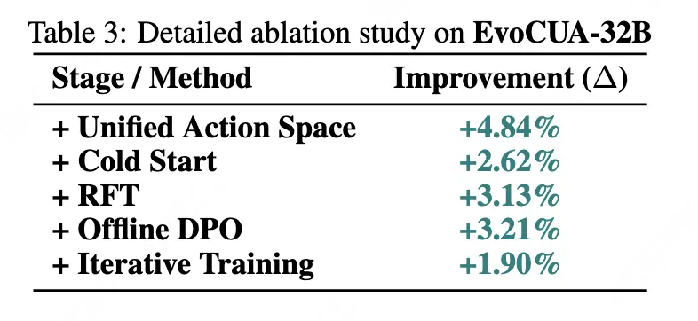 為了探究 EvoCUA 性能提升的來源,我們進行了逐層拆解的消融實驗。