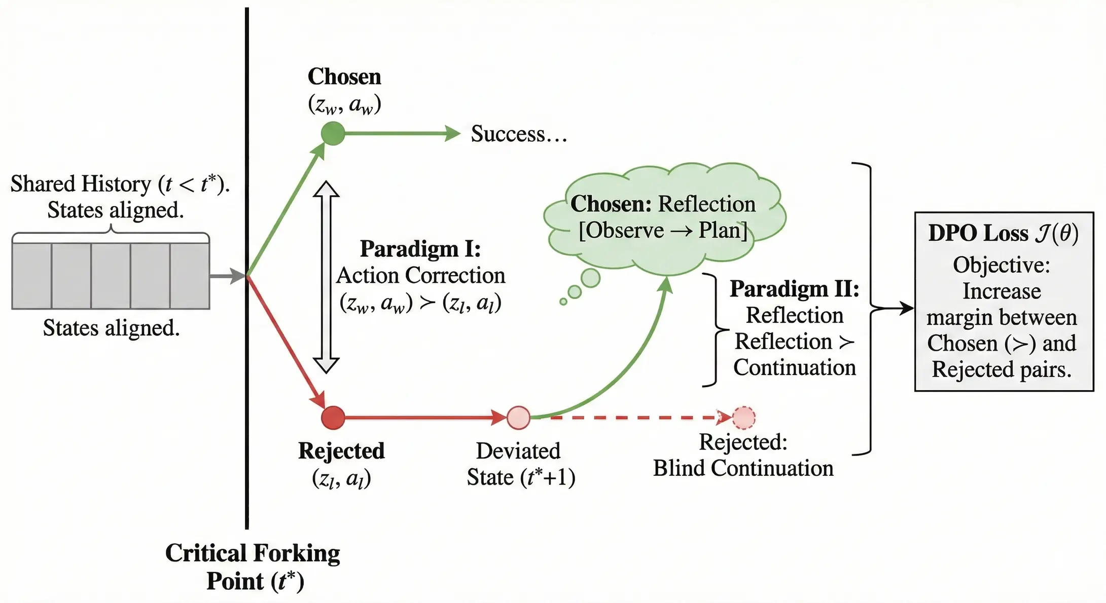 雙範式偏好對構建:一旦通過因果診斷鎖定了關鍵錯誤,我們並未止步於簡單的行為克隆,而是針對出錯瞬間"和"出錯之後"兩個不同的時空切片 , 構造了兩種截然不同的 DPO 偏好範式,從而在一次訓練中同時兼顧了準確性與魯棒性。