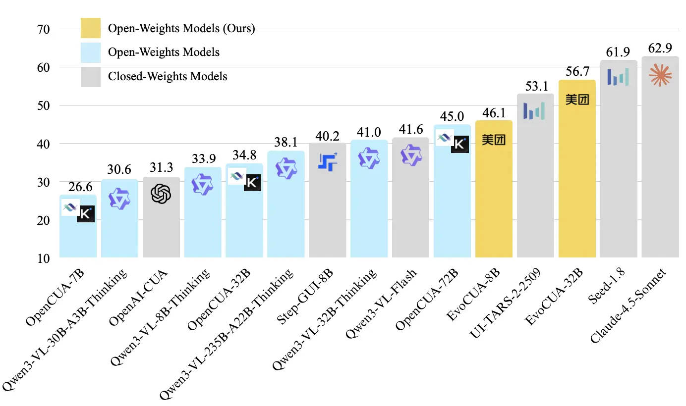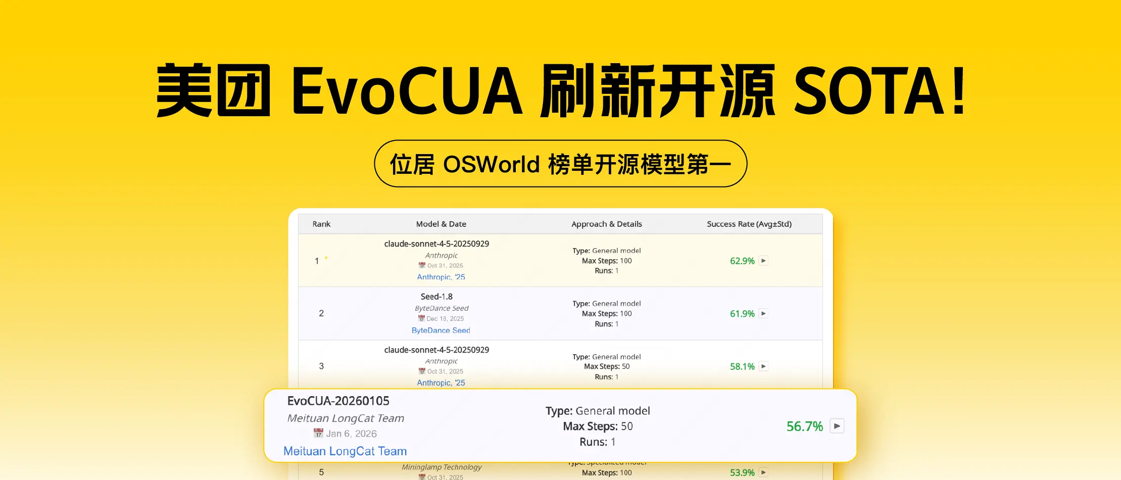 大模型雖已具備強大的感知與推理能力,但在面對複雜的計算機圖形界面操作(Computer Use)任務時,仍受限於高質量數據稀缺與環境交互反饋缺失的雙重挑戰。美團技術團隊推出了 EvoCUA 模型並在Github、Huggingface開源,通過構建可驗證數據合成引擎與十萬級併發的交互沙盒,將訓練範式從傳統的"靜態軌跡模仿"轉變為高效的"經驗進化學習"。該方案在權威評測基準 OSWorld 上以 56.7% 的成功率刷新了開源 SOTA(2026年1月6日榜單),驗證了基於經驗的進化範式在 GUI 智能體領域的有效性。