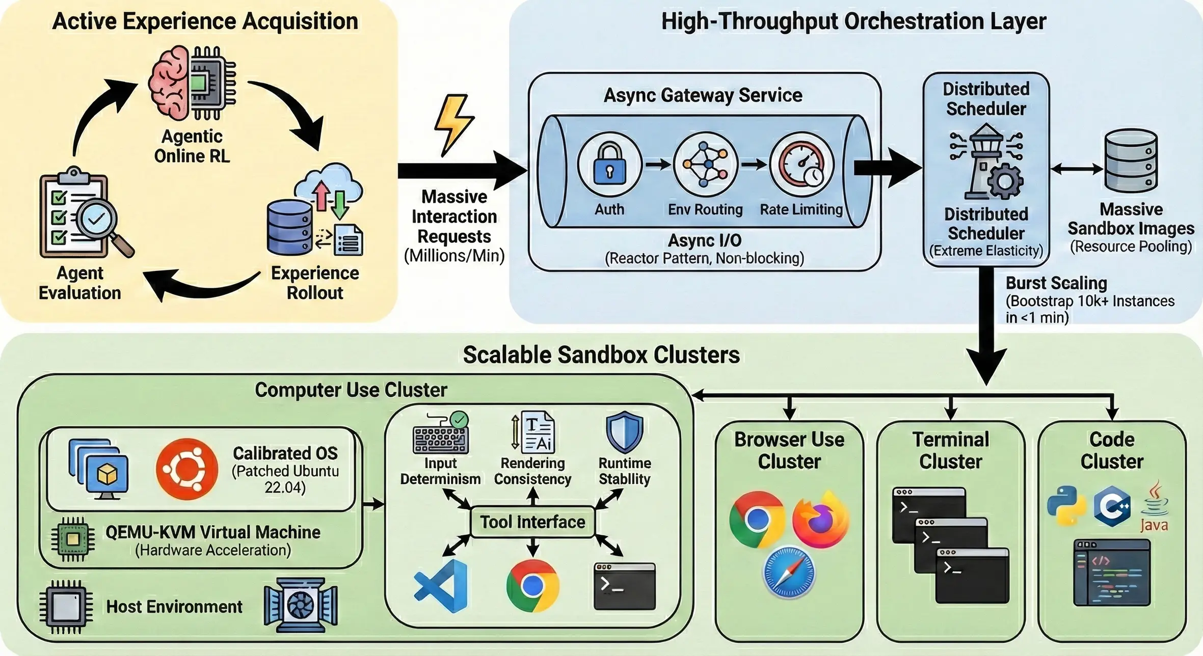EvoCUA 的進化範式要求 Agent 進行大規模的探索來合成經驗軌跡。我們面臨的挑戰是工業級的:如何在一個集羣中穩定調度 100,000+ 個每日活躍沙盒,處理百萬級的分鐘交互請求,同時保證每個環境的嚴格隔離與毫秒級響應。為此,我們構建了一套統一的環境沙盒平台,在調度吞吐與環境保真度兩個維度做了大量優化。