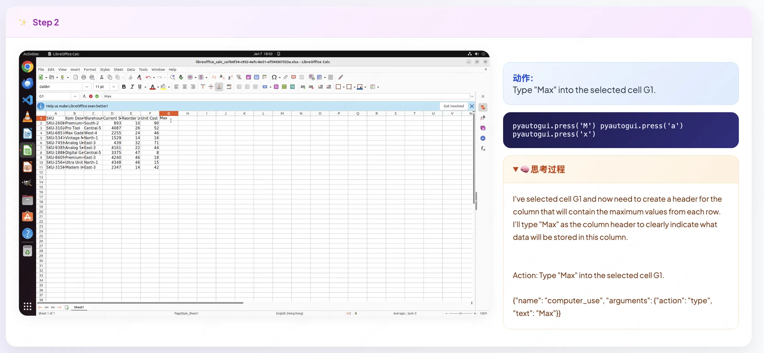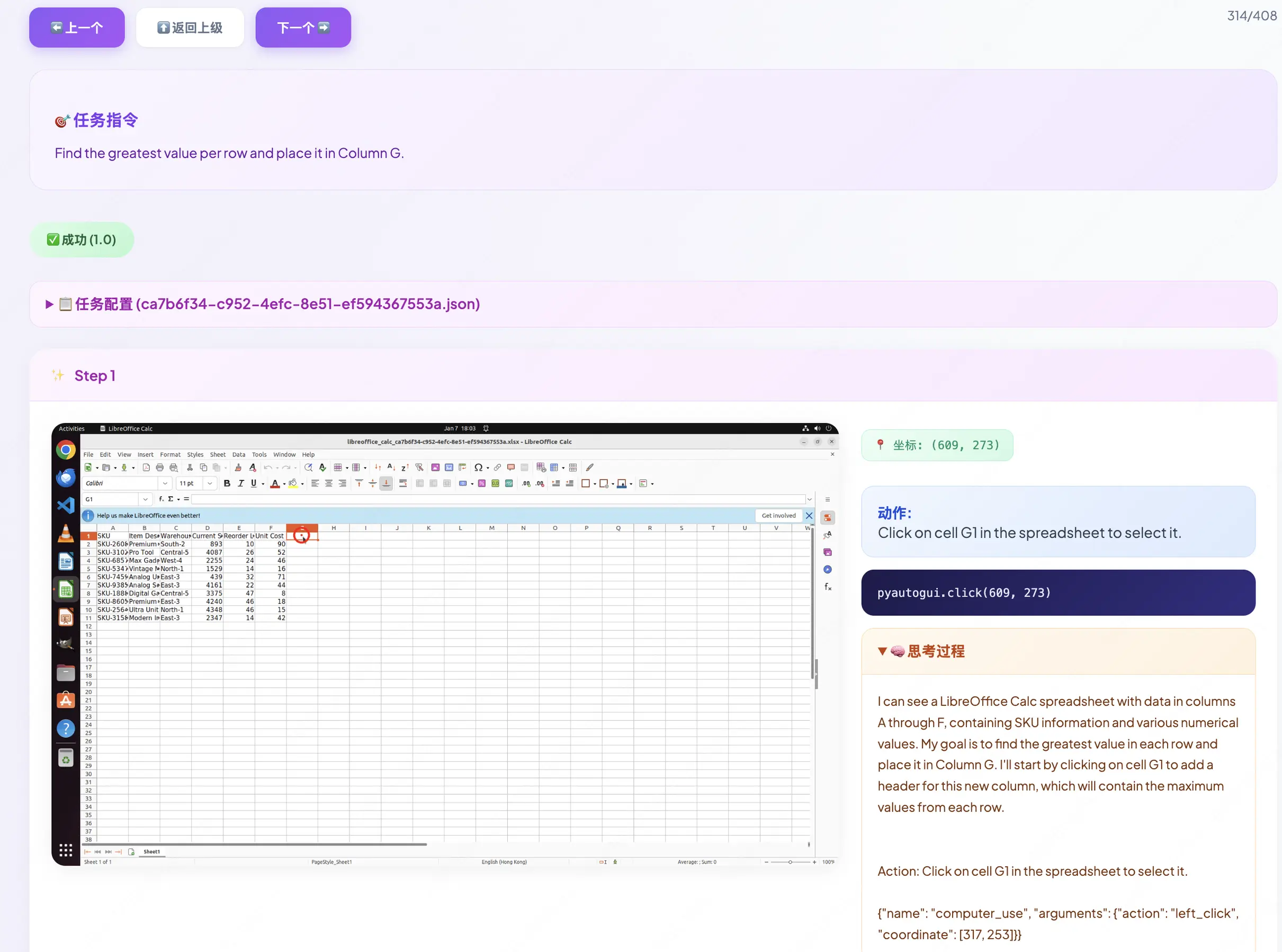 我們隨機抽樣一條合成指令任務,對訓練後的模型採樣軌跡進行可視化。以一個電子表格任務為例:"找出每行的最大值並填入 G 列",以下是EvoCUA-32B在四個關鍵時刻的思考與執行過程: