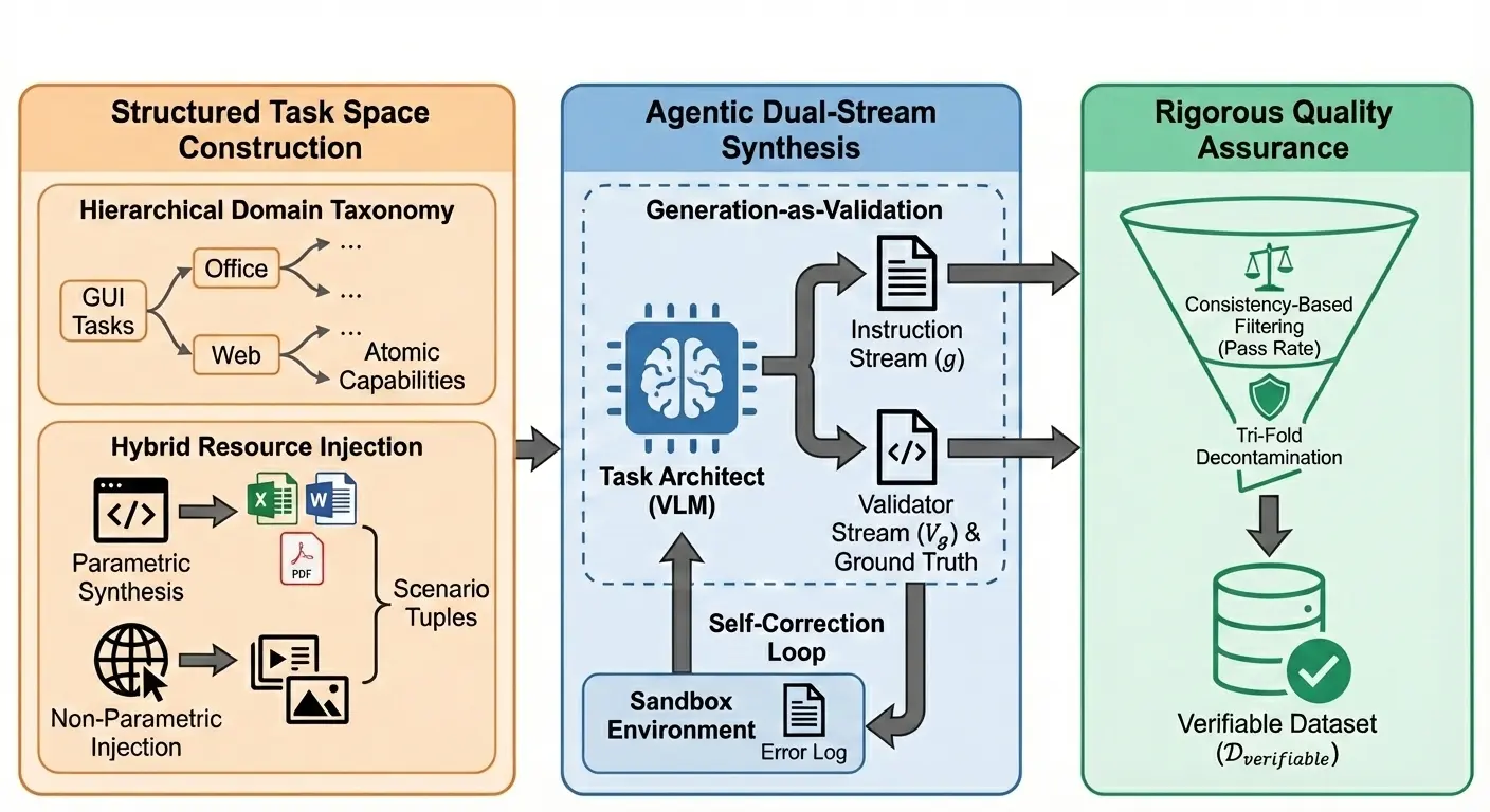 - 數據合成質量低: 真實的高質量軌跡數據極度稀缺且昂貴,而試圖用大模型直接生成數據往往會陷入"幻覺"。模型生成的指令或計劃經常看似合理,但在真實的 UI 狀態下根本不可執行。