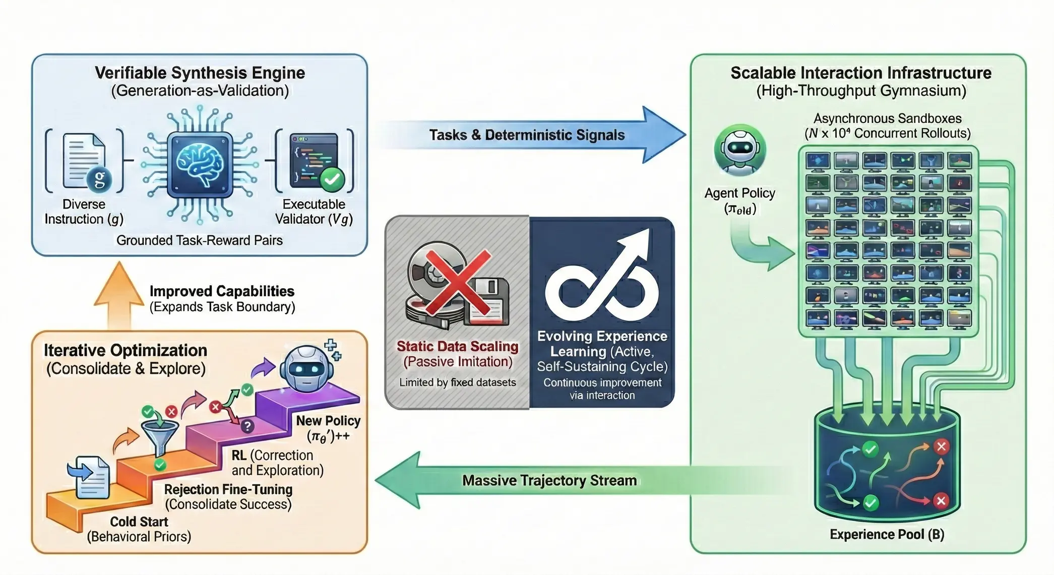 EvoCUA 的核心在於構建"交互-反饋-修正"的閉環。我們針對數據、環境、算法三個維度構建了自維持的進化架構:可驗證數據合成引擎 負責生產高質量任務,高併發交互基建 支持海量軌跡合成,基於經驗的迭代算法提供模型進化的關鍵路徑。