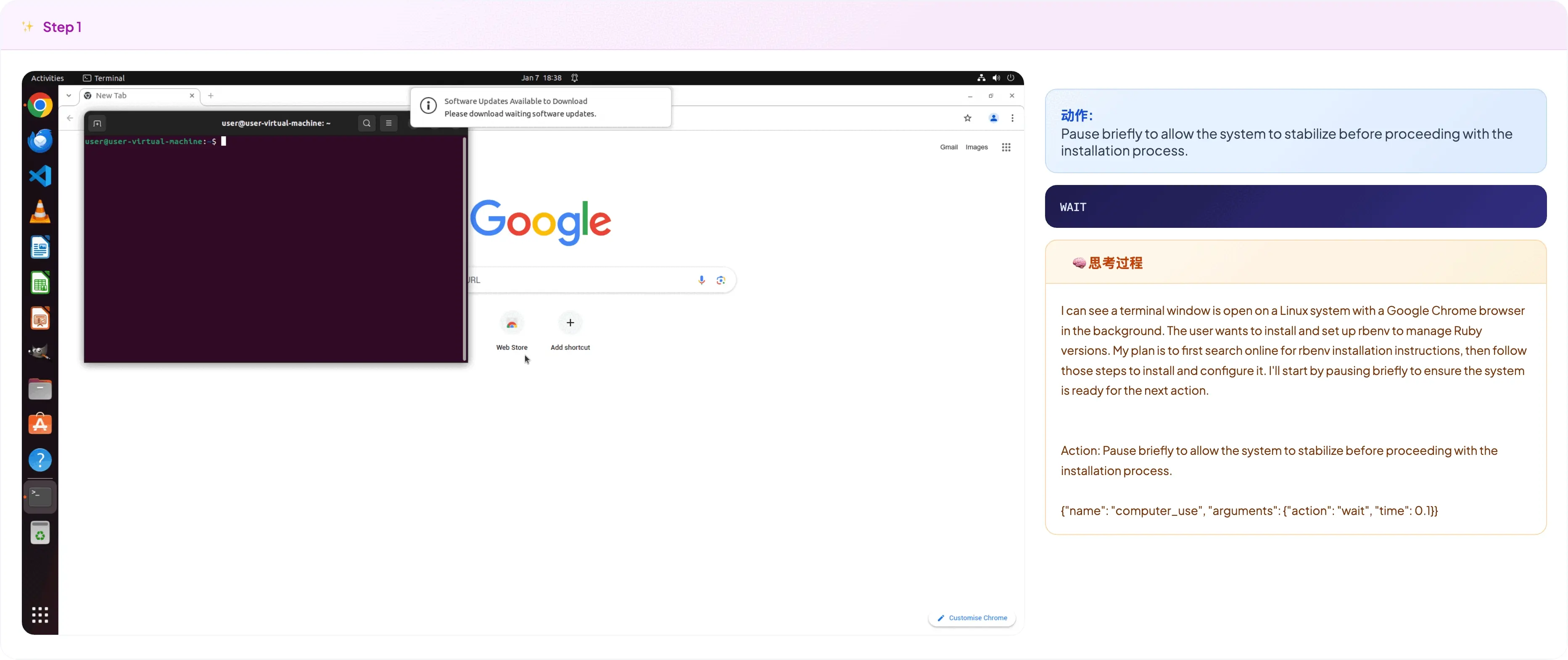 經過冷啓動訓練後,模型展現出了明顯的行為範式轉變。它不僅掌握了終端和複雜快捷鍵的操作,更重要的是學會了"慢思考"------在關鍵節點進行校驗和反思。這為後續的大規模進化提供了堅實的原子能力基礎。