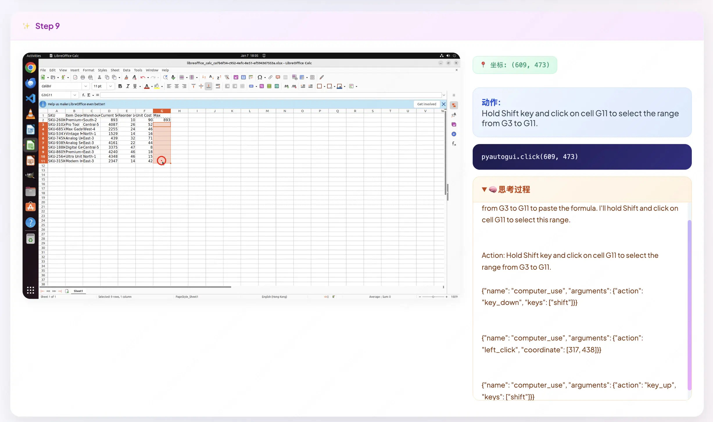 Step 9:有狀態鼠標交互,專業軟件操作常涉及"按住並點擊"等組合動作。智能體執行"Shift+點擊"操作以選中 G3 到 G11 的數據範圍。