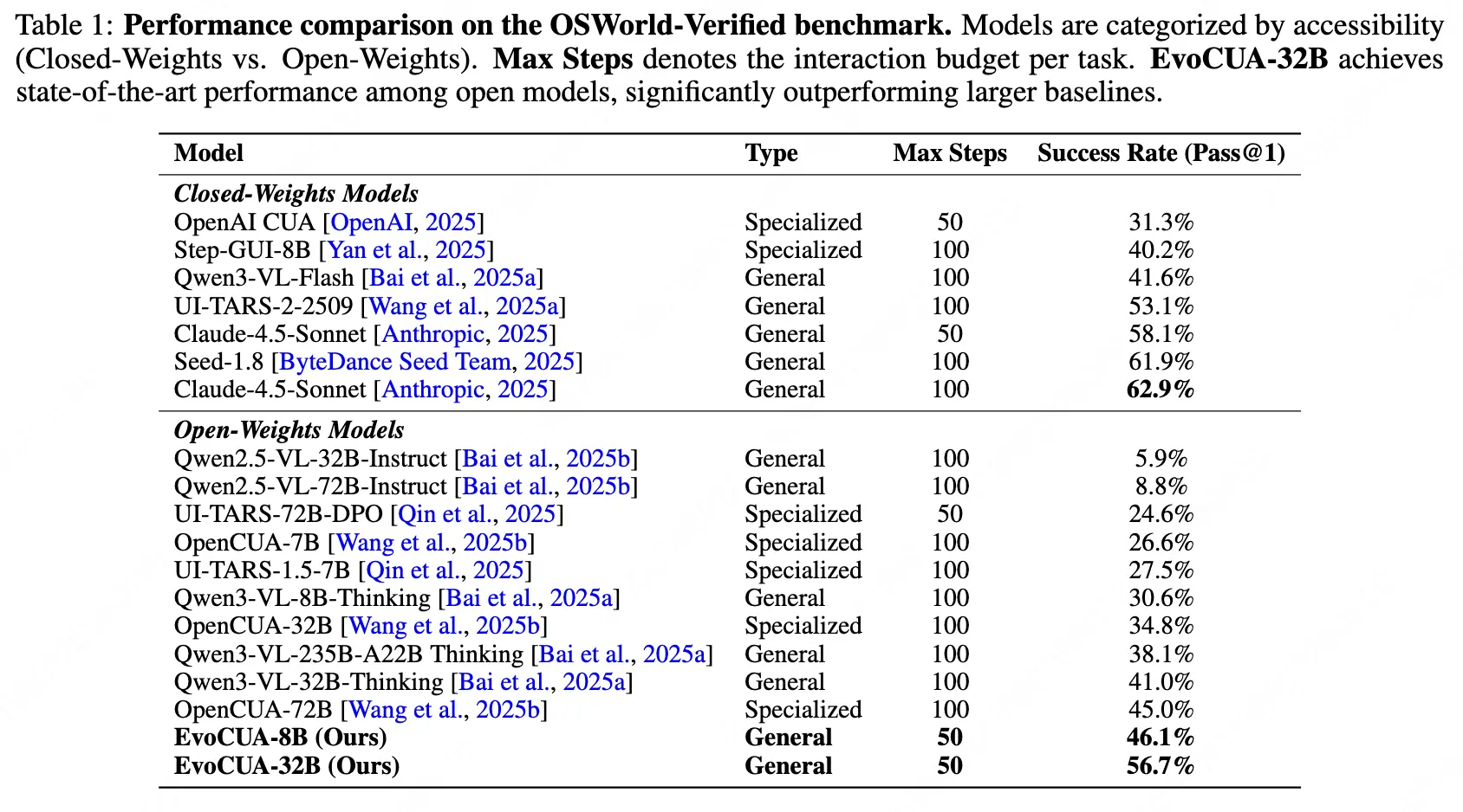- 開源SOTA:我們的主力模型 EvoCUA-32B(基於 Qwen3-VL-32B-Thinking 後訓練)達到了 56.7% 的成功率。這一成績大幅領先此前的開源 SOTA(OpenCUA-72B, 45.0%)。值得注意的是,EvoCUA-32B 超越了閉源強基線 UI-TARS-2-2509 (53.1%)。在嚴格限制 50 步 推理預算的同等條件下,我們與行業頂尖的 Claude-4.5-Sonnet (58.1%) 差距縮小至僅 1.4%。