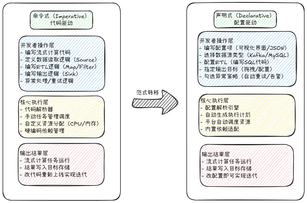 聲明式(寫配置):開發者需要聲明****“做什麼”(What)****,而“怎麼做”則交由底層引擎去完成。