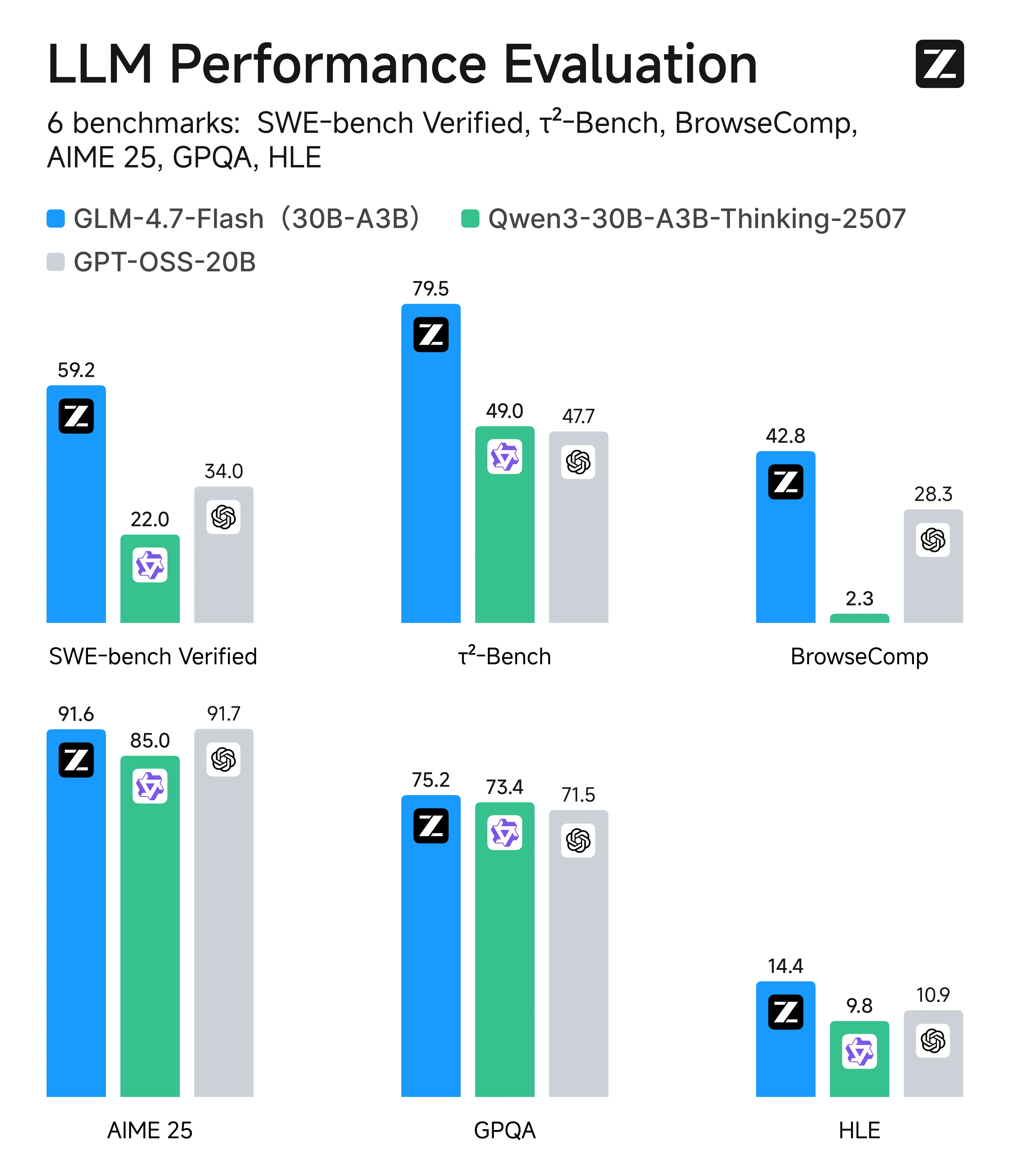 據介紹,在SWE-bench Verified、τ²-Bench等主流基準測試中,GLM-4.7-Flash的綜合表現超過gpt-oss-20b、Qwen3-30B-A3B-Thinking-2507,在相同和近似尺寸模型系列中取得開源SOTA分數。
