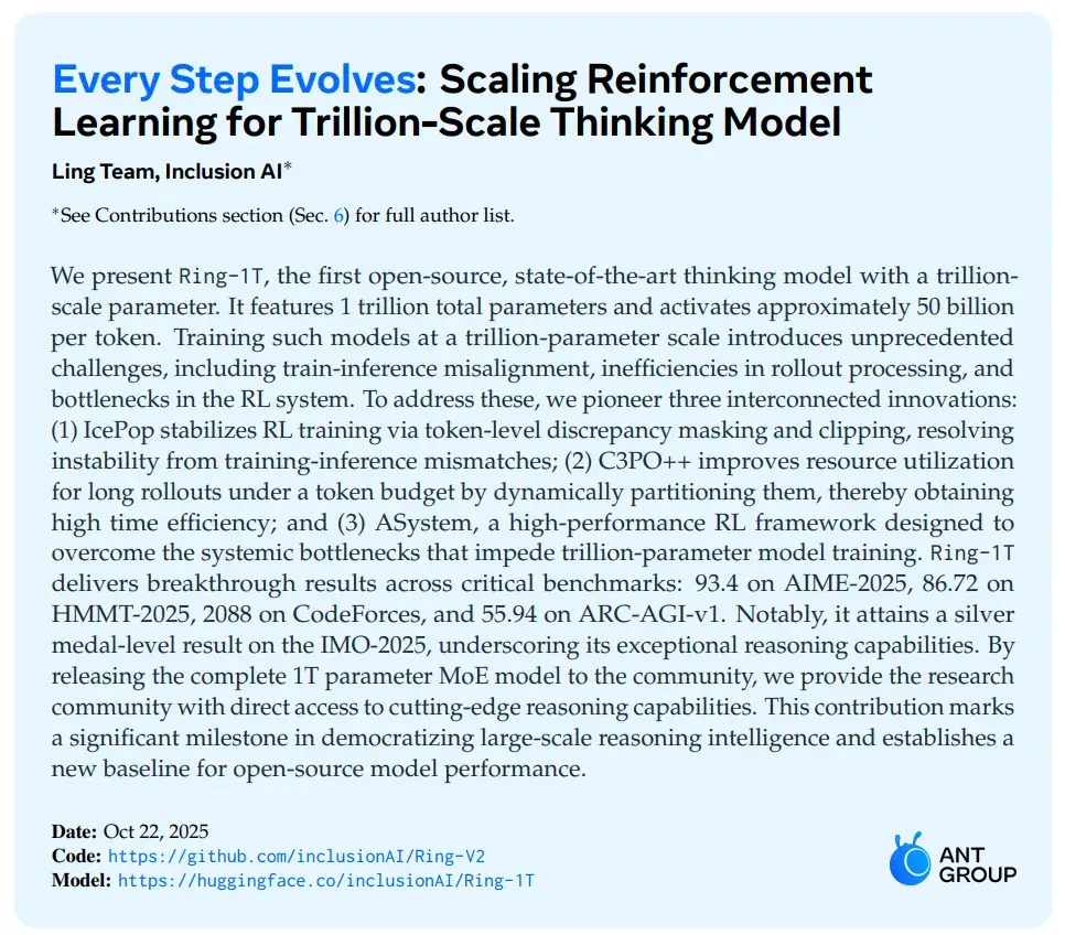 - Ring-1T :一款基於 Ling 2.0 架構的思考模型,也是全球首個開源萬億參數思考模型。