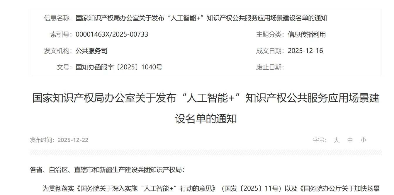 國家知識產權局於12月22日正式發佈了首批“人工智能+”知識產權公共服務應用場景建設名單。本次遴選共產生18項典型應用場景,涉及北京、上海、江蘇、浙江等12個省份。