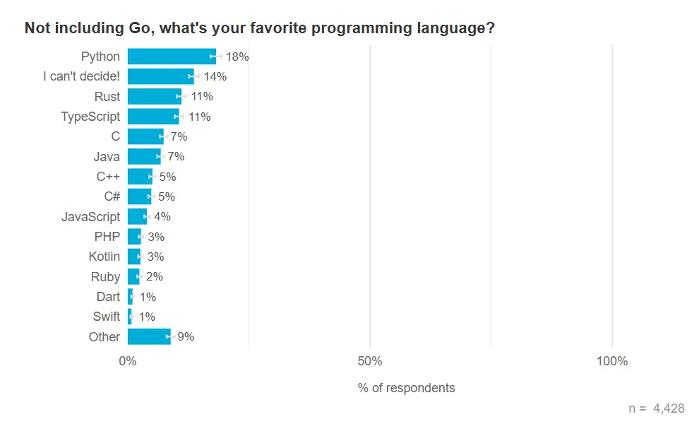 就其他編程語言而言。受訪者表示,除了 Go 之外,他們還喜歡使用 Python、Rust 和 TypeScript 等多種語言。這些語言的一些共同特點與 Go 開發者反映的常見痛點相吻合,例如錯誤處理、枚舉和麪向對象設計模式等方面。