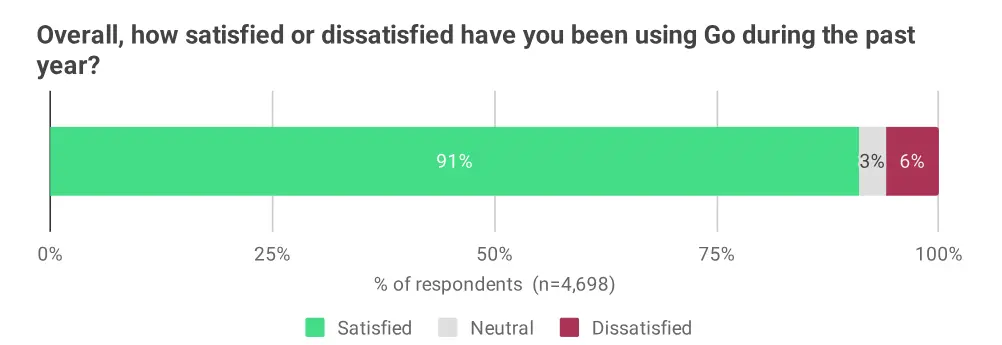 絕大多數受訪者(91%)表示在使用 Go 語言時感到滿意。近三分之二的受訪者表示“非常滿意”,這兩個指標自 2019 年以來一直保持着穩定。