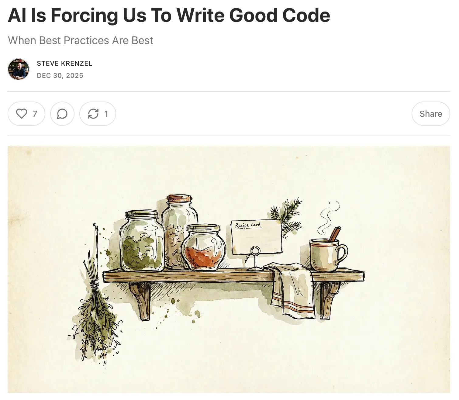 文章提出了一個反直覺的觀點:與其説 AI 會導致代碼質量下降(充滿垃圾代碼),不如説為了有效利用 AI,開發者必須被迫採用更好的軟件工程實踐。 作者認為,如果你的代碼庫混亂、耦合度高、缺乏文檔,AI 輔助工具(如 Cursor, Copilot 等)的效果就會大打折扣。反之,為了讓 AI 發揮最大效用,你需要編寫模塊化、清晰且易於理解的代碼。這種需求實際上倒逼開發者去遵循經典的“優質代碼”標準。