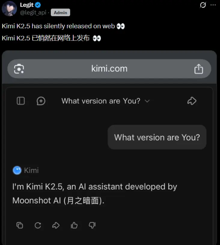 用户反饋顯示,原本的K2模型在聊天界面中已自動切換為K2.5,包括思考模式(Thinking)和多模態支持。這次更新被視為對K2系列的迭代優化,旨在進一步提升AI的智能交互能力。