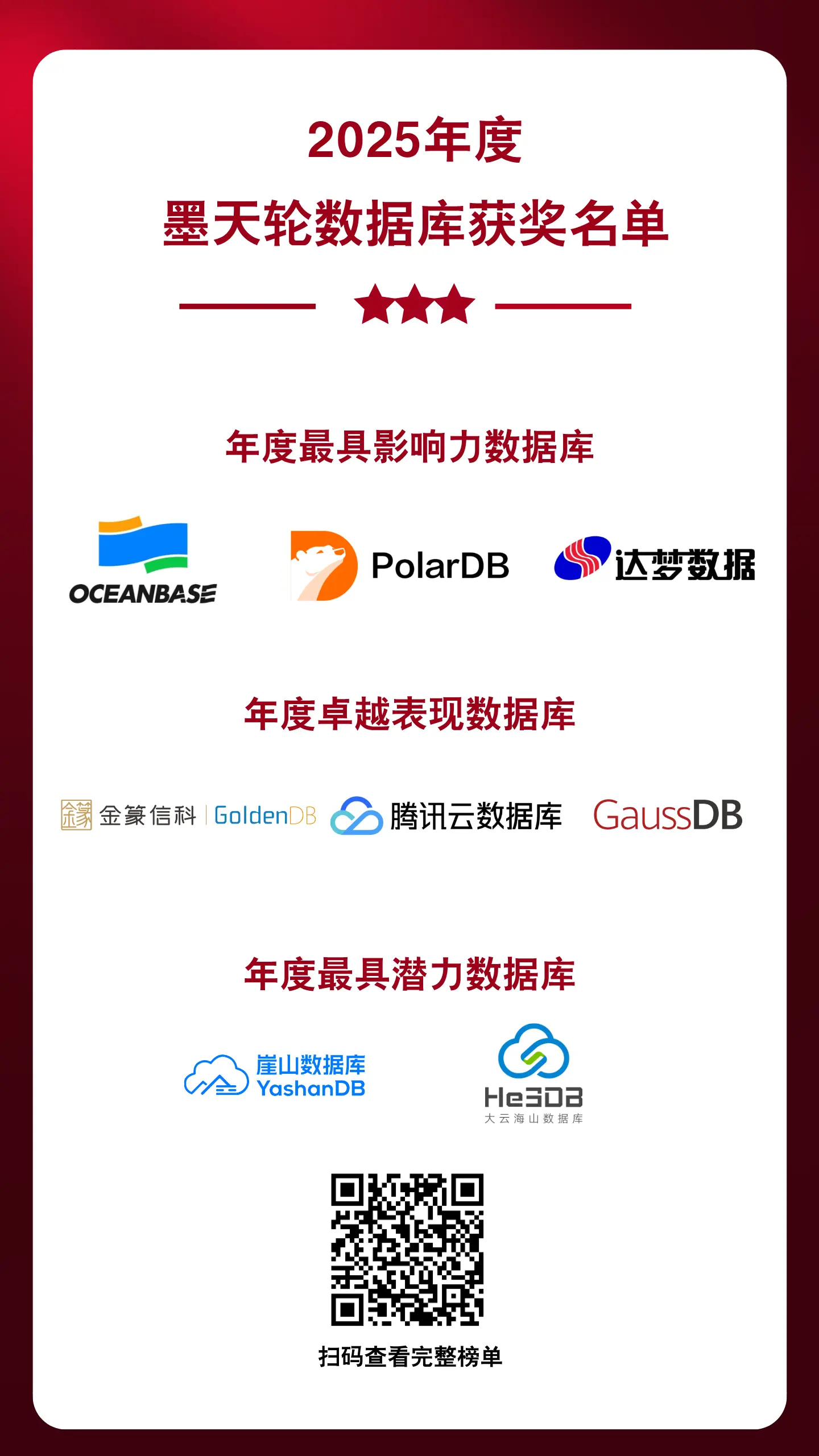 三、見證榮耀時刻,2025年度數據庫獎項揭曉