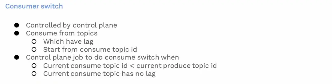 消費的切換是相當直接的。消費者由控制平面指定從哪裏消費消息。從指定的消費 ID 開始消費,或者消費主題裏面滯後的消息。一旦完成,控制平面將更新消費者主題 ID 並移至下一段,這個時候,消費者就可以發送切換了。