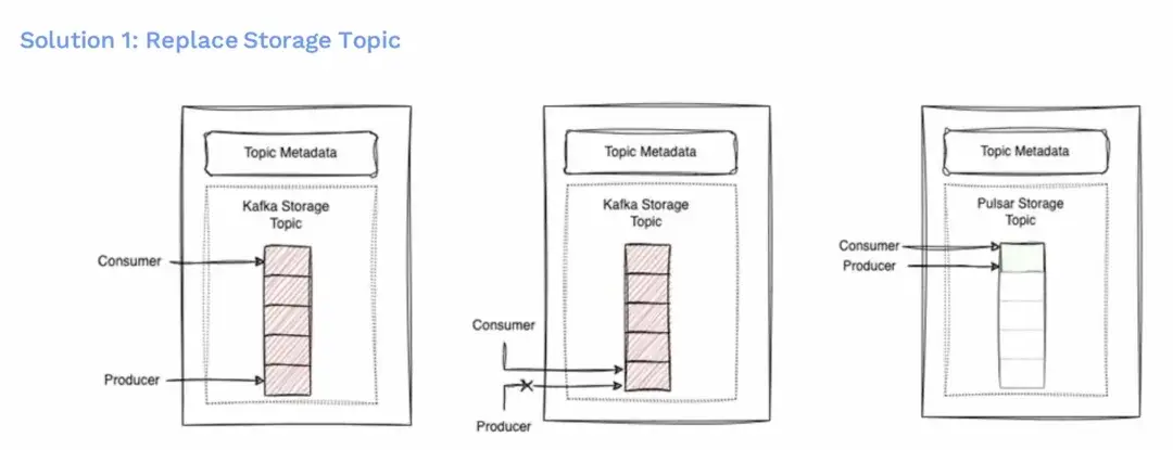 第一個方案是更換存儲 Topic,這是最簡單的方案。但是要從 Kafka 替換為 Pulsar 的存儲主題,我們得先暫停生產,等待消費者追上來。一旦完成同步,也就是説 Kafka 存儲主題中的所有消息都被消費了,然後我們就可以用 Pulsar 替換它了。同時生產者和消費者的指針都是切換到 Pulsar。這樣就可以從 Pulsar 主題上進行消費和生產了。