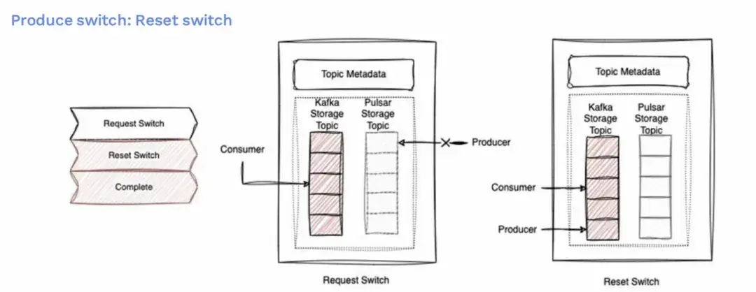 如果出現失敗,例如在請求步驟中,生產者指向了 Pulsar 上,但無法生產消息。這時候將重置切換,生產指針將回到 Kafka 主題,並開始只向 Kafka 發送消息。整個操作將被標記為完成,但狀態為失敗。