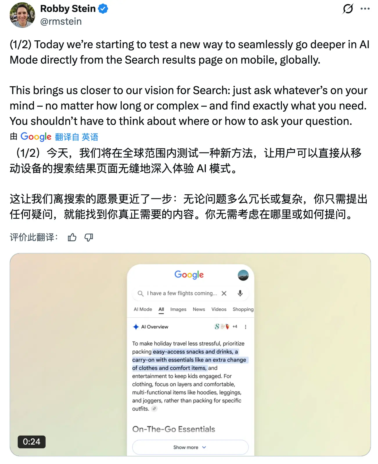 簡單來説就是,當用户在手機端進行搜索時,會先看到一個由 AI 自動生成的“快速概覽/摘要”,接着用户可以直接在同一頁發起對話式追問 — 無需跳轉到另一個“AI Mode”標籤頁。這項測試目前只對移動端用户開放,並且是全球範圍內逐步推送。