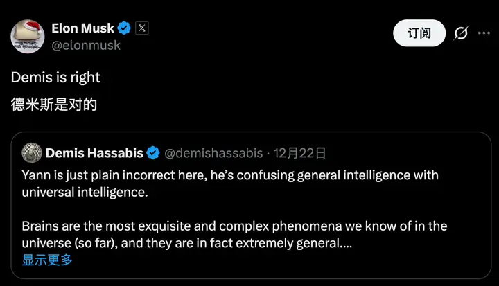 馬斯克則轉發了Hassabis的推文,説道:“Hassabis是對的。”
