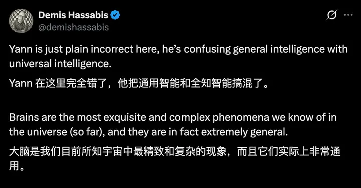 Hassabis 轉發了上述內容,並強調“楊立昆完全錯了,他把通用智能和全知智能(general intelligence & universal intelligence)搞混了”。Hassabis表示,大腦是人類目前所知宇宙中最精緻和複雜的現象,而且它們實際上非常通用。