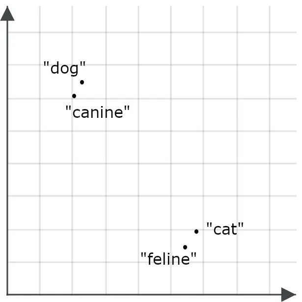 為了理解這對搜索應用為何重要,可以想象單詞 “ dog ” 和單詞 “ cat ” 各自對應為空間中的兩個點: