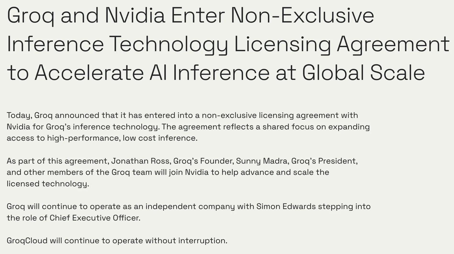 Groq宣佈已與英偉達就其推理技術達成非獨家授權協議。該協議體現了雙方共同致力於拓展高性能、低成本推理技術的應用範圍。