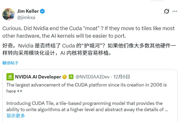 芯片設計界資深人物、曾參與AMD Zen、蘋果A系列和特斯拉Autopilot設計的Jim Keller認為,如果未來的主流GPU編程逐漸轉向這種Tile-based方式,開發者一旦習慣了這的模式,那麼同一套程序邏輯就更容易移植到不同的GPU硬件上,不像過去的CUDA那樣高度綁定NVIDIA硬件,這可能會給AMD、Intel或新興的AI公司提供切入機會。