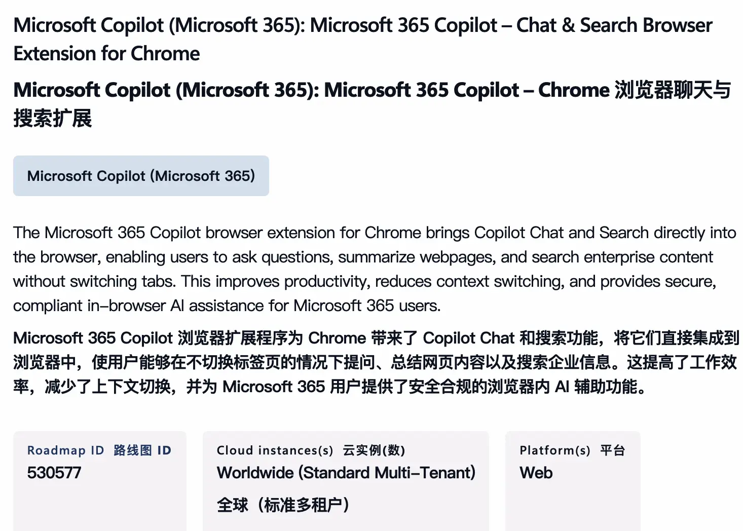 從微軟官方 Roadmap 的披露信息來看,這款擴展將集成 Copilot Chat 與 Copilot Search,能夠在 Chrome 內直接調用聊天、總結、問答、以及基於企業內部 Microsoft 365 數據的搜索功能。這體現了微軟的戰略調整:不是強迫所有人都用 Edge 瀏覽器,而是通過擴展的方式,把核心 AI 能力推廣到 Chrome 上,畢竟“不是所有人都想用 Edge”。