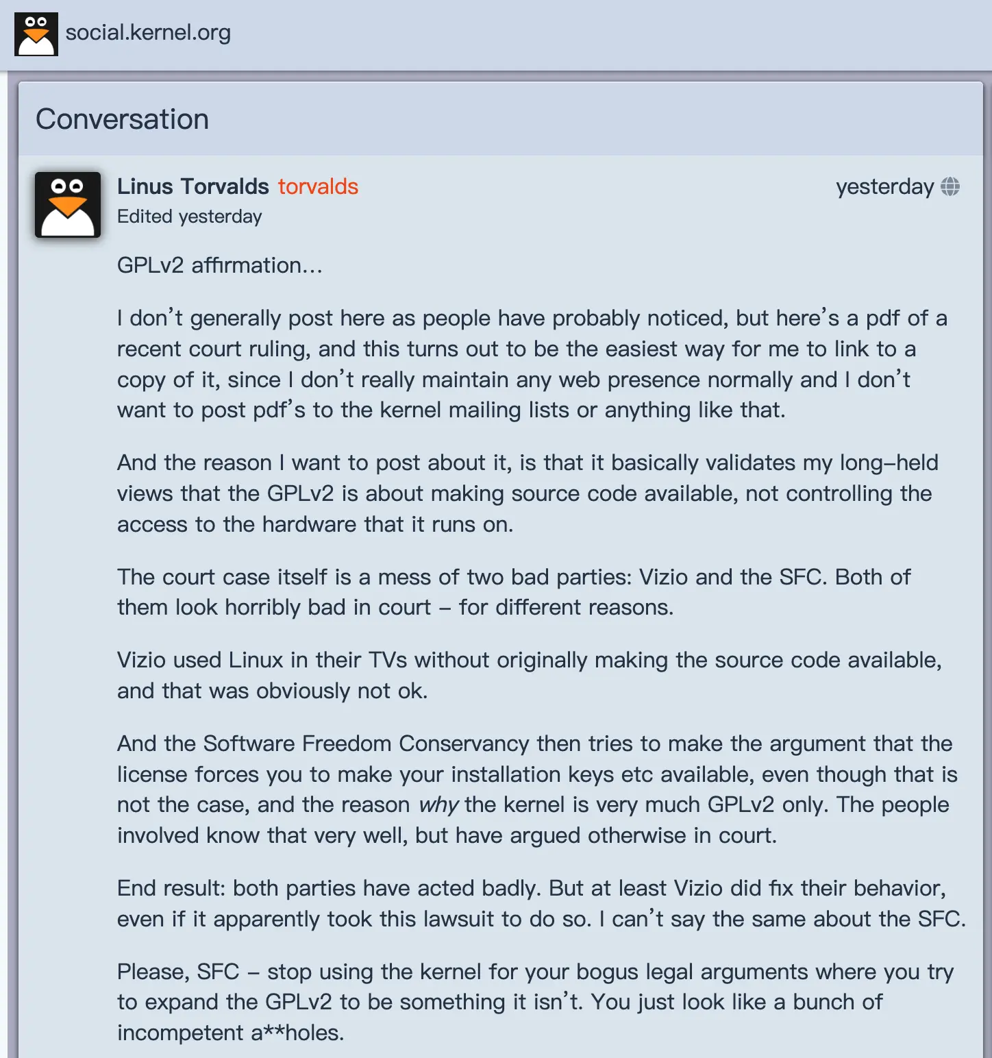 Linus 指出,GPLv2 僅保障代碼自由,不控制硬件訪問,並批評 SFC 試圖擴大協議範圍,稱其主張缺乏法律依據,雙方行為均不盡如人意。