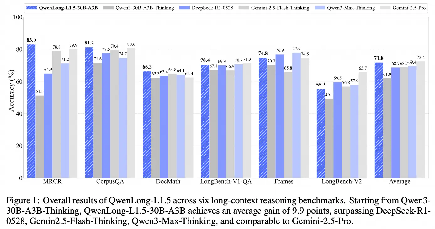 阿里巴巴通義Qwen團隊發佈了最新的開源 QwenLong-L1.5 模型 ,主打超長上下文推理和記憶管理能力,構建於 Qwen3-30B-A3B-Thinking 模型之上,並增強記憶機制以處理超出其物理上下文窗口(256K)的任務。