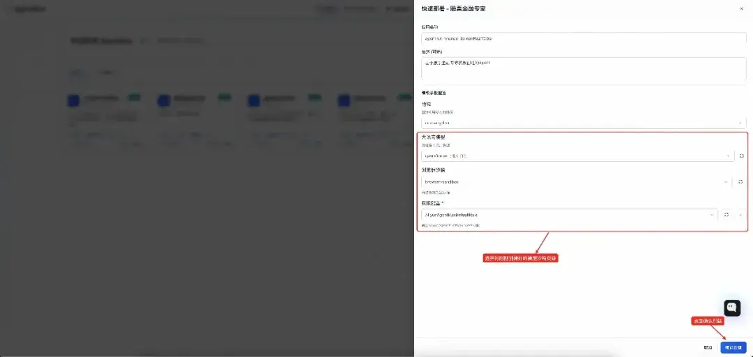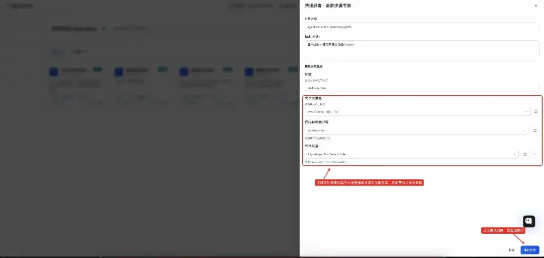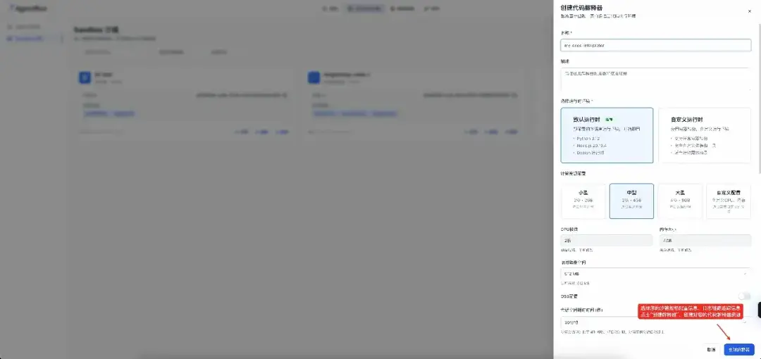 選擇剛剛創建好的大語言模型和沙箱資源,點擊確認創建,創建此 Agent 應用